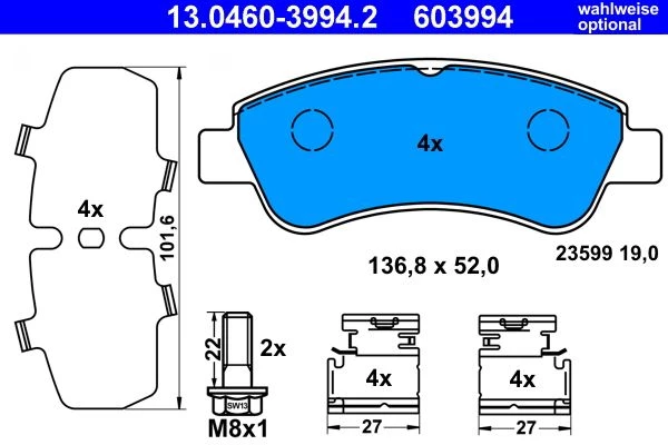 Der Bremsbeläge mit der Artikelnummer 13.0460-3994.2 von ATE ist ein hochwertiges Ersatzteil für eine zuverlässige und sichere Fahrzeugfunktion. Das Produkt Bremsbelagsatz, Scheibenbremse (13.0460-3994.2) wurde nach strengen Qualitätsstandards gefertigt und bietet eine präzise Passform für kompatible Fahrzeuge.